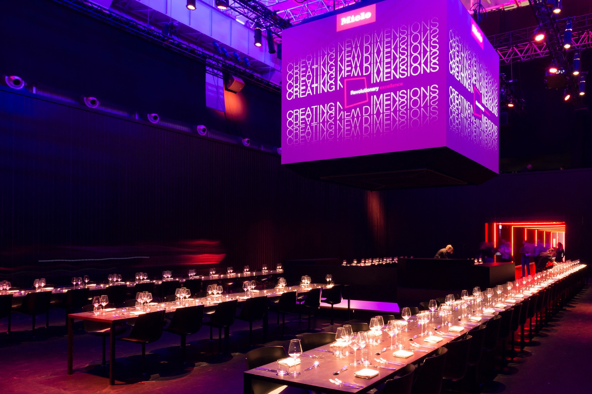 - Portal, Akkreditierungsbereich und Tunnel bespannten wir mit mehreren hundert Quadratmetern schwarzem Stoff und verlegten eine ebenso große Menge schwarzen PVC-Fußboden, um eine einheitliche Ästhetik zu gewährleisten.